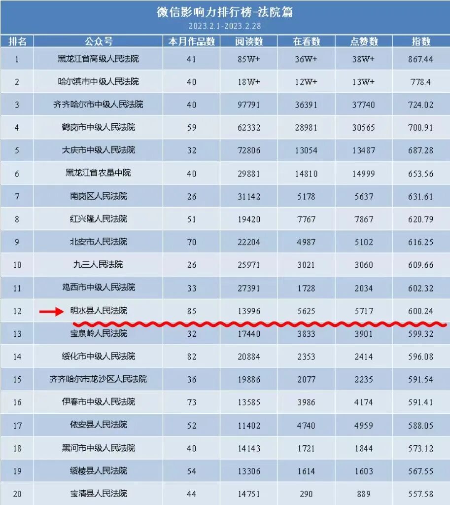 【上榜啦】明水法院微信公众号进入黑龙江省政法机关微信公众号影响力月度排行榜!!!