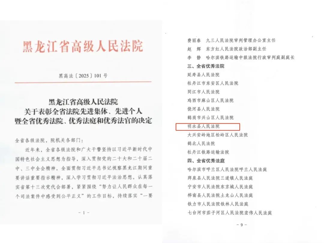 近日,黑龙江省高级人民法院公布《关于表彰全省法院先进集体、先进个人暨全省优秀法院、优秀法庭和优秀法官的决定》。其中,明水县人民法院荣获“全省优秀法院”荣誉称号!